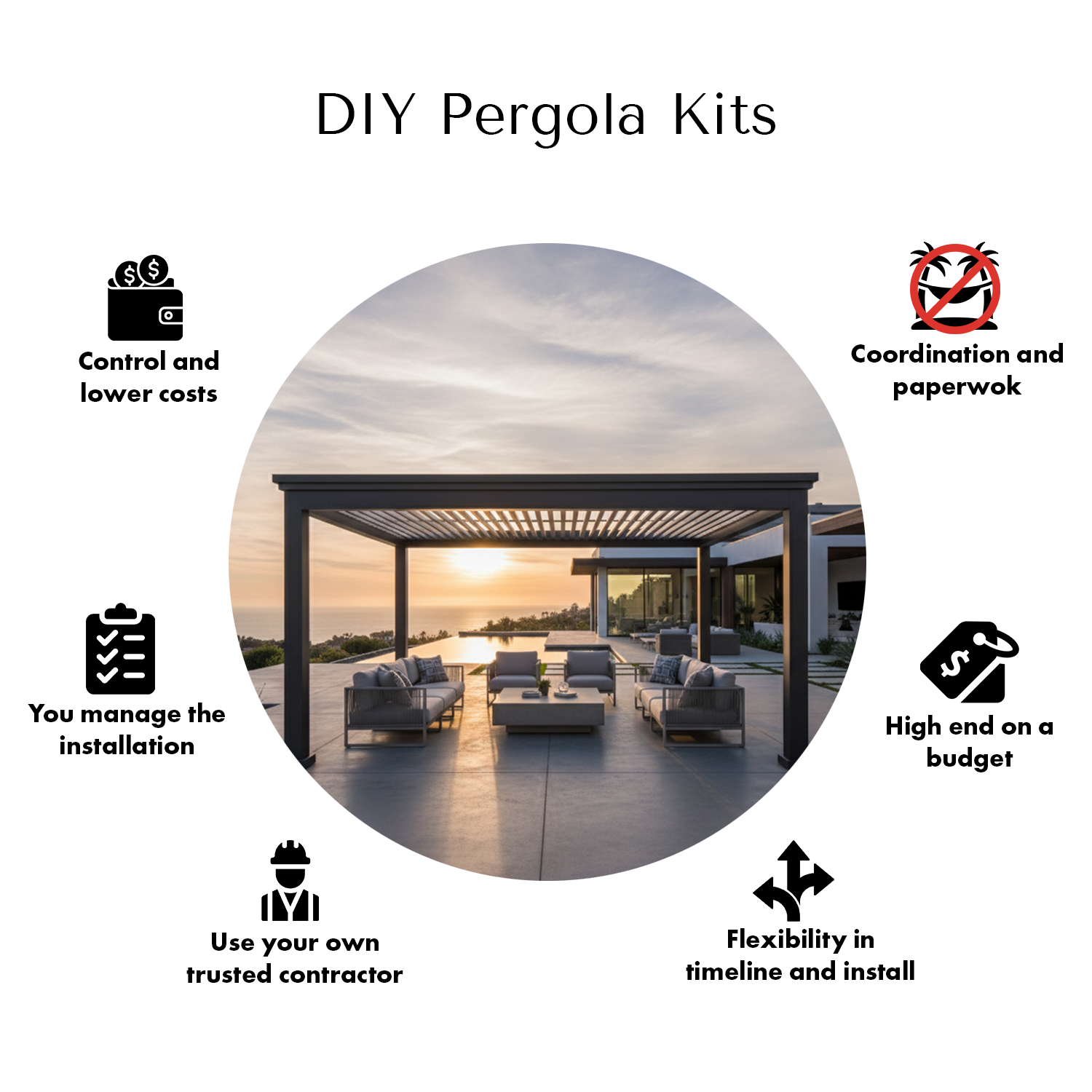 The DIY installation option saves money by giving homeowners more control and reducing labor costs. Once the DIY kit is shipped to your home, you can decide when the pergola is installed and by whom. You can work at your own pace or schedule your handyman installer at your convenience. In exchange for a little more effort, or just a little project management time, you can expect to save up to 60% compared to the the cost of a similar pergola installed by a dealer. It's a lower initial cost that avoids dealer mark-up and even when factoring in the cost of a contractor, DIY installation is still usually the more cost effective choice. A little planning can save thousands of dollars on the structure and add extra money to accessorize the overall outdoor space.
